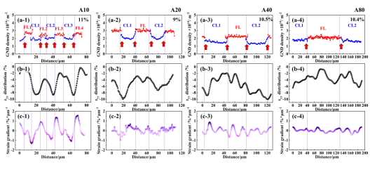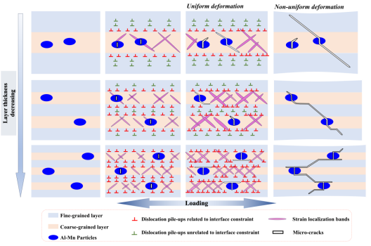 层状金属通常表现出强度与塑性的同步提高,其原因在于层状组元具有不同的微观结构和力学性能,界面处变形不协调,形成界面应变梯度,产生界面几何必需位错,从而导致额外的应变硬化能力。然而,以下问题仍有待进一步澄清:首先,大多数研究采用不同样品和不相关技术分别表征应变梯度和几何必需位错密度,这意味着应变梯度与几何必需位错密度之间的关系并不能通过实验完全解决,仍然局限于理论建模。其次,微裂纹的形核和扩展过程决定了金属的延展性,但在不同层结构参数的多层金属中,微裂纹在何处成核以及如何扩展,目前仍不清楚。此外,微裂纹成核扩展与应变局部化之间的关系也鲜有报道。
