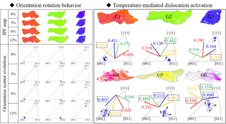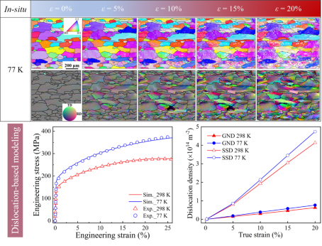 金属结构材料的超低温应用具有广阔前景。传统金属材料在低温条件下发生显著强度-塑性倒置关系,严重限制了其使用。然而,铝合金材料不发生低温韧脆转变;优异的低温强塑性协同提升效应及其物理机制使得铝合金获得持续关注。针对这一难题,研究团队设计并开发依托扫描电镜的低温原位力学加载装置,耦合原位EBSD/DIC等先进表征手段,实现对铝合金在室温和液氮温度下变形全周期的低温关键变形特征直接定量表征。对于具有等轴微观组织的铝合金,通过原位EBSD试验探究室温和低温变形过程中晶体取向等关键变形特征的演化行为,发现低温变形晶粒表面没有观察到明显的微变形带及滑移迹线;根据显著的取向散点分区和基于Taylor轴的理论取向转动路径,确认低温变形晶粒中开动的多滑移系类型。结合位错机制的晶体塑性有限元模拟,阐明不同位错组分对强韧化机制的贡献;低温变形过程显著提高统计存储位错和螺型位错比例,因而显著提高合金应变硬化能力,促进低温下均匀塑性变形。该研究工作不仅为理解铝合金低温塑性变形行为提供了新的见解,同时也为开发超低温应用的高性能金属材料提供了指导意见。