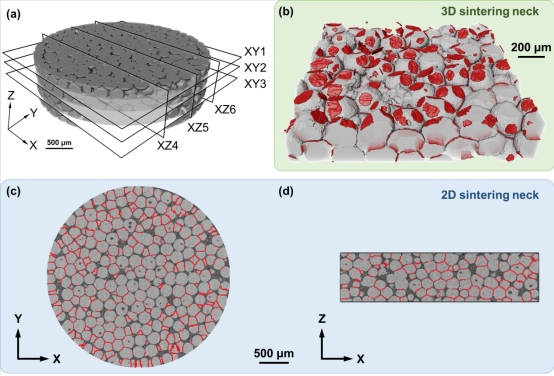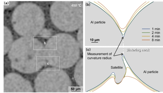热压烧结具有低烧结温度、快速烧结速度和高致密化等特点,广泛应用于金属材料的制备加工,然而,对于烧结的原位研究目前的表征通常是通过2D技术进行的,即对具有不同烧结时间的样品进行横截面切片和抛光,然后使用光学显微镜或扫描电子显微镜观察二维烧结特征。该方法面临两个局限性:(1)非原位方法本身就无法精确跟踪烧结颈部的演变,因为只能通过大视野的统计分析来描述烧结颈部演变的趋势;(2)烧结颈部是3D特征,而从横截面获得的2D结果可能会引起偏差。此外,颗粒形状的影响在烧结中至关重要,因为它决定了各种粉末特性,包括流动性、混合能力、堆积密度、烧结性等。相比之下,形状不规则的相邻颗粒具有更多的接触点,为烧结过程中的扩散过程提供了额外的途径,例如气体雾化会导致形成形状各异的卫星颗粒。然而,二维统计方法得出的数据可信度以及卫星颗粒对烧结过程中的影响还需进一步进行研究。