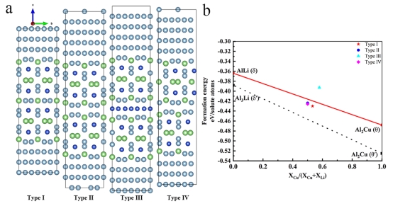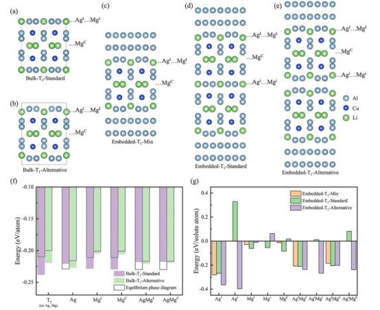 通过原子级分辨率电镜表征,可以确切地观察到Mg和Ag偏聚在T1相的原子位点:在最小厚度单元的T1相中,Mg原子倾向于占据T1相中心原子层的Li原子位置,Ag原子则部分取代T1相在T1/Al界面处成对的Al原子列中。对于观察到粗化的T1相,银的偏析行为与粗化T1相的结构有关。具体表现为:标准T1相(即另一篇文章中的Type Ⅰ)仅在T1/Al界面处成对的Al原子列中观察到Ag偏聚,而在Type Ⅱ中,Ag可以进入内部的Al-Li层。随后根据实验上观察到的T1相结构构建原子模型,结合第一性原理计算,从热力学角度对Mg、Ag偏聚行为的稳定性进行了验证,确认了Mg和Ag共同偏聚在T1相中有利于T1相的稳定性。本研究首次详细探讨了Mg和Ag在T1相中的分布规律,填补了这一领域的研究空白。