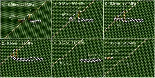 图1 荷载驱动下基面位错与孪晶界的相互作用的模拟效果