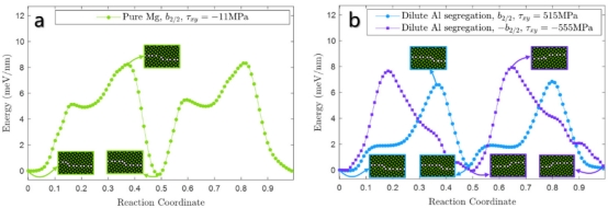 针对上述问题,信运昌教授团队采用分子动力学模拟方法,以镁{10-12}孪晶界和基面位错塞积模型为研究对象,分析了溶质偏聚程度对位错演变的影响。结果显示,孪晶界的活动性与溶质偏聚浓度呈负相关,且当溶质偏聚饱和时,基面位错到非基面位错的演变方可发生。为探究背后机理,团队计算了不同偏聚浓度下孪晶位错的滑移能垒,模拟了孪晶位错偶极在不同偏聚浓度、不同荷载下的动力学行为。该研究从能量学和位错学的角度,揭示了溶质偏聚通过调控孪晶界活动性来间接影响镁中非基面滑移的产生机制,有望为镁合金各向异性的调控研究提供指导。